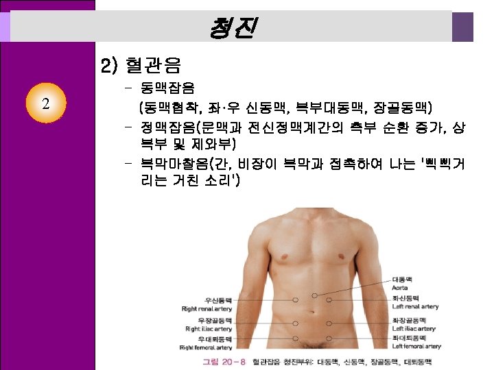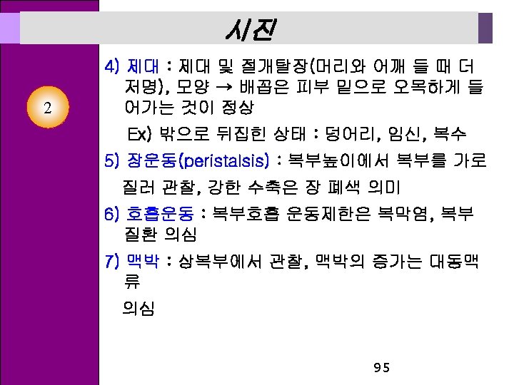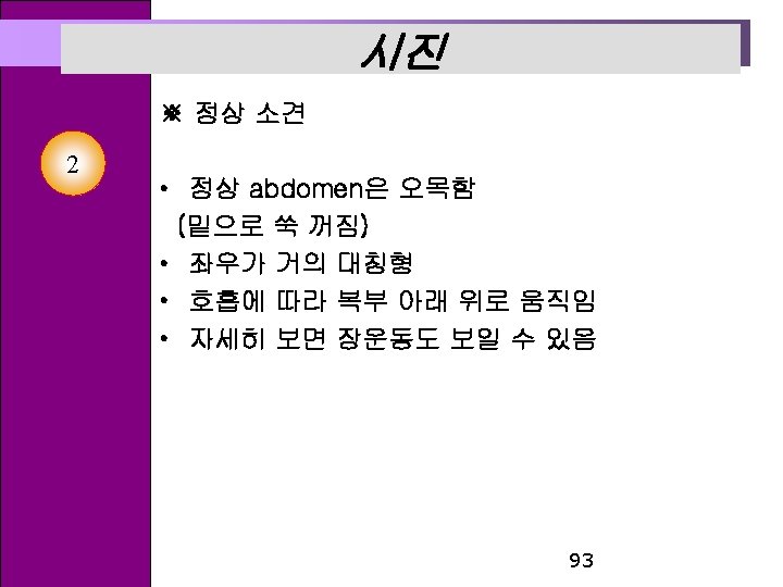 시진 1) 피부 : 색소침착, 병변, 반점, 선, 상흔 2 2) 복부 윤곽선의 대칭성 : tumor, ascites (bulging flank), distended bladder (suprapubic bulging), hernia (inguinal, femoral) 3) 혈관변화 : 정맥류 → portal hypertension시 collateral circulation 이 abdominal surface에서 발달함 94