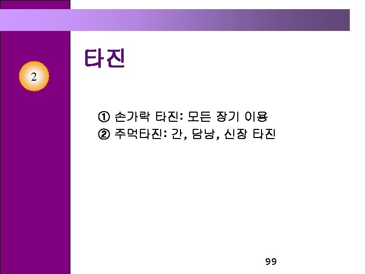 Liver: 타진: liver span 2 1. 중앙 쇄골선에서 측정 시작 2. lung의 resonance 들리는 부위에서 간 을 향해 아래로 타진하여 간 상부 경계 dullness듣기 3. Mark the spot (usually 5 th intercostal space) 4. 복부의 tympany 들리는 부위에서 간을 향 해 위로 타진하여 간 하부 경계 dullness 듣기 in the midclavicular line. 1. Mark where the sound changes from tympany to a dull sound (normally at the right costal margin) 2. Measure the distance between the two marks. 3. 여자와 키 작은 사람 : 범위보다 좁다. 남자와 키 큰 사람 : 넓다 102