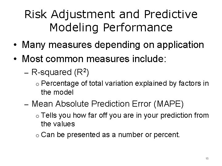 Risk Adjustment Types • Retrospective – Use factors in the previous period to predict previous period outcome • Concurrent – Use factors in the current period to predict final current period outcome • Prospective – Use factors from previous period, including the outcome (if available), to predict future period outcome 15