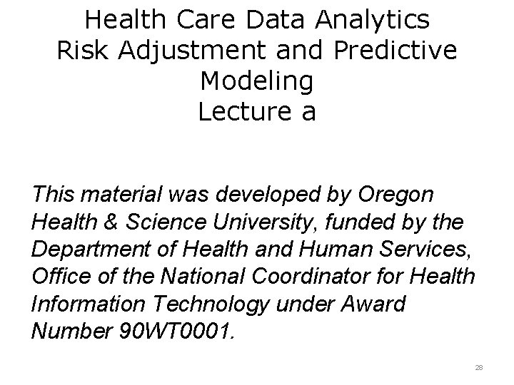 Health Care Data Analytics Risk Adjustment and Predictive Modeling Lecture a This material was developed by Oregon Health & Science University, funded by the Department of Health and Human Services, Office of the National Coordinator for Health Information Technology under Award Number 90 WT 0001. 28