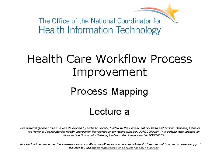 Health Care Workflow Process Improvement Process Mapping Lecture a This material (Comp 10 Unit 2) was developed by Duke University, funded by the Department of Health and Human Services, Office of the National Coordinator for Health Information Technology under Award Number IU 24 OC 000024. This material was updated by Normandale Community College, funded under Award Number 90 WT 0003. This work is licensed under the Creative Commons Attribution-Non. Commercial-Share. Alike 4. 0 International License. To view a copy of this license, visit http: //creativecommons. org/licenses/by-nc-sa/4. 0/