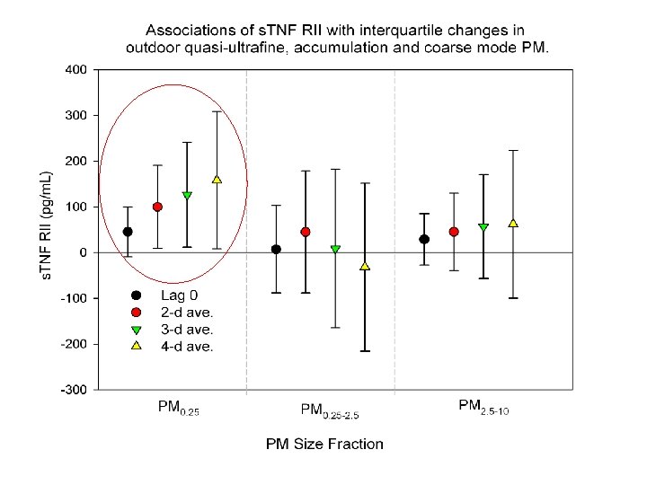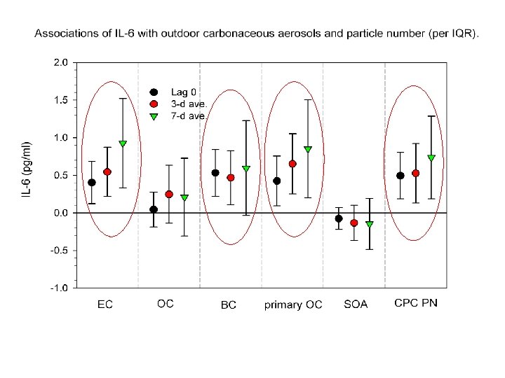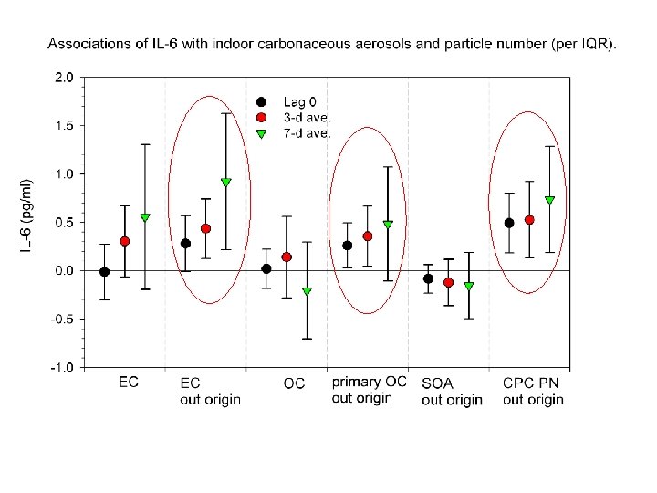 Conclusions n Positive associations of biomarkers of systemic inflammation with PM are largely driven by markers of primary combustion sources (EC, BC, primary OC); n Outdoor PM associations are supported by associations for indoor exposures to PM of outdoor origin; n PN and quasi-ultrafine conc. are more strongly associated with biomarkers than accumulation mode PM & SOA supporting hypotheses regarding UFP (translocation? );