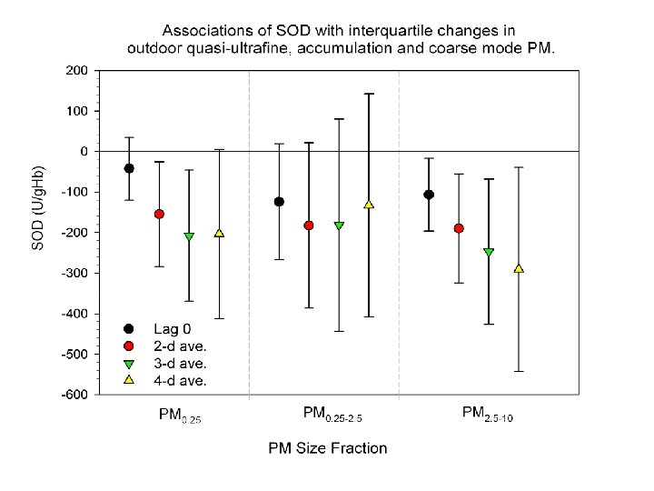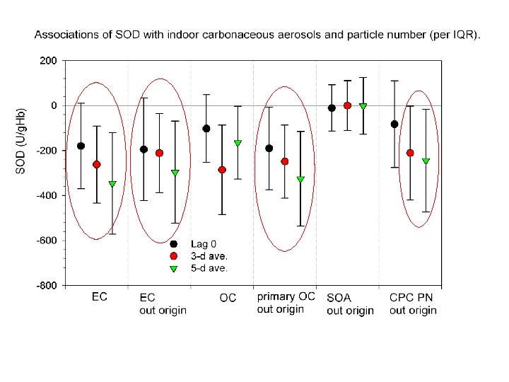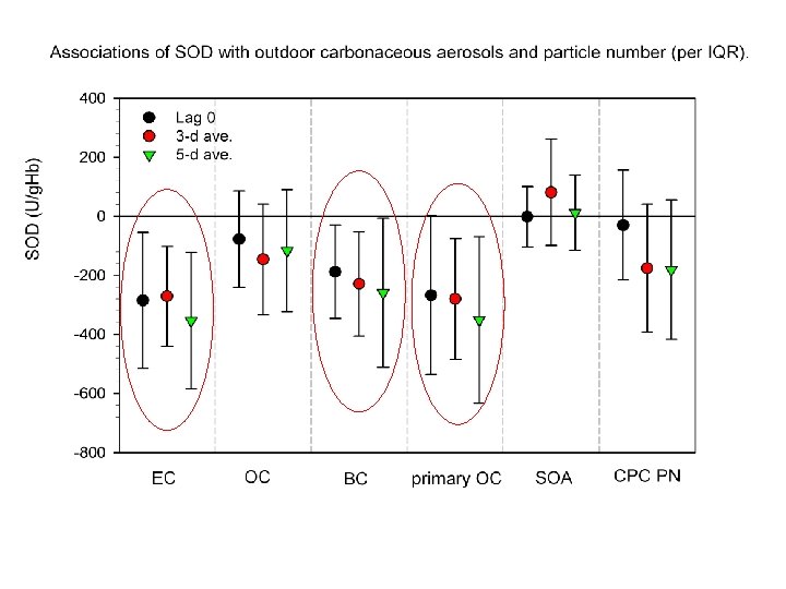 Conclusions n Inverse associations of biomarkers of antioxidant activity (SOD and GPx) with PM are also largely driven by markers of primary combustion sources (EC, BC, primary OC); n Inactivation of antioxidant enzymes (SOD, GPx-1) by ROS, RNS or electrophiles may be one mechanism of pollutant-induced systemic inflammation and thrombosis. n These findings are consistent with the view that oxidative stress and inflammation may underlie the morbidity and mortality findings.