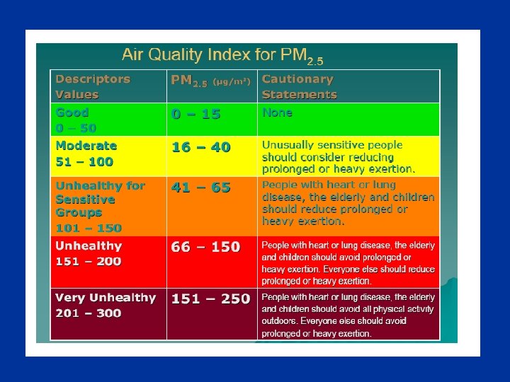 www. epa. gov/nheerl/research/pm • “Research indicates that air pollution in the form of particulate matter, or PM, at concentrations currently allowed by national standards (the National Ambient Air Quality Standards, or NAAQS) is linked to thousands of excess deaths and widespread health problems. Part of the EPA’s mission is to protect human health by strengthening the scientific basis of air quality regulations. ”
