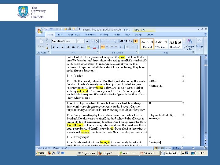 Methodology • Fox and Ward (2008 a): 1. Close reading of interviews to identify the richness of relations in the assemblage. 2. Look for processes that stabilise or limit possibilities of action. 3. Hypothesise assemblages. 4. What (else) can the body do? = Identity.