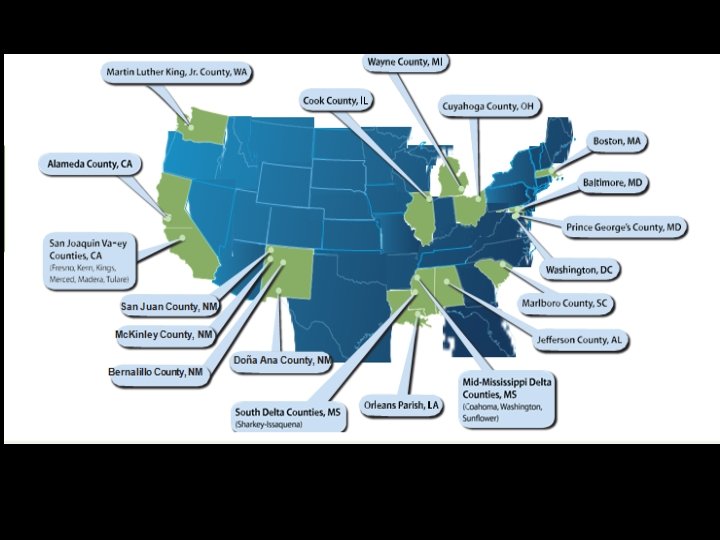 PLACE MATTERS • …is a national initiative of the National Collaborative for Health Equity designed to build the capacity of local leaders around the country to identify and improve social, economic, and environmental conditions that shape health. The objective of this initiative is to eliminate health disparities by identifying their complex underlying causes and defining strategies to address them. • Addressing upstream causes of health (such as environmental health risks and issues related to employment, education, poverty, and housing) through community action, policy development, and measuring the indicators associated with these determinants of health are at the heart of our PLACE MATTERS work.