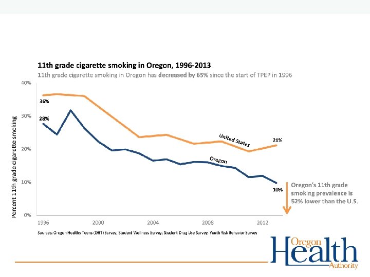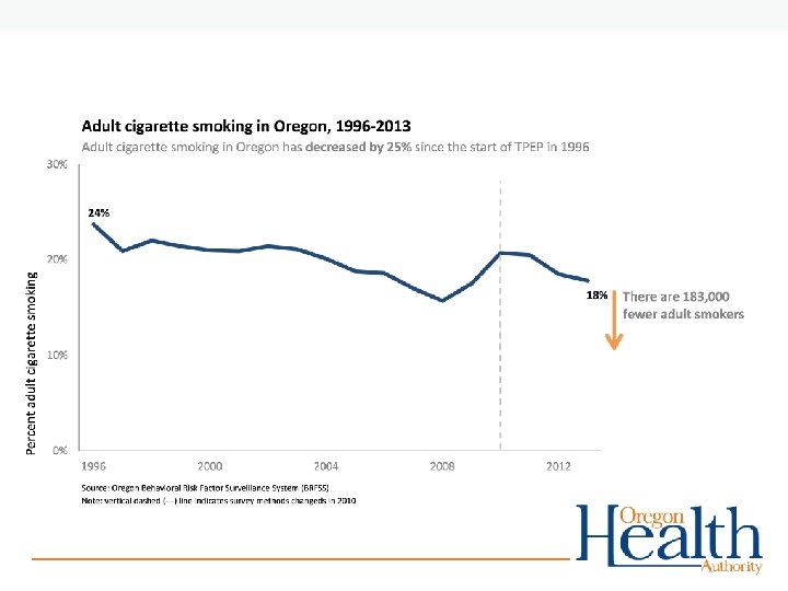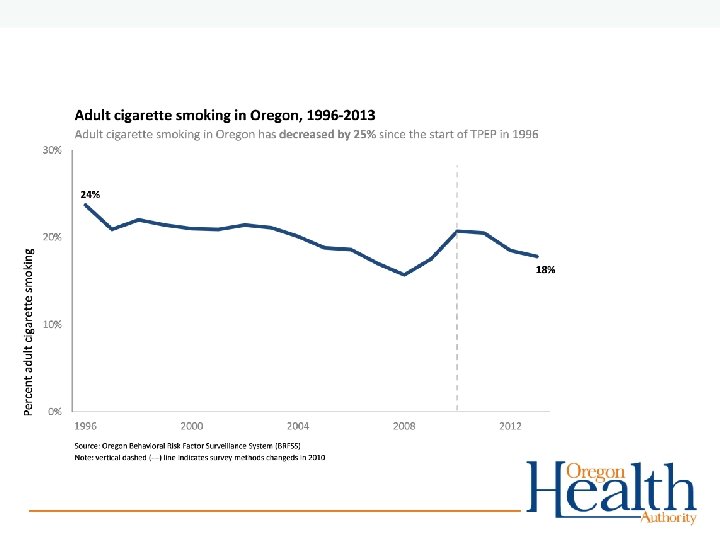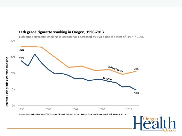 Tobacco highlights • Passage of HB 2546 – Includes electronic cigarettes and other vaping devices in Oregon’s Indoor Clean Air Act (ICAA) • This portion becomes law January 1, 2016 – Bans the sale of vaporizers, nicotine liquid and other accessories to minors • This portion became law as soon as Governor signed • Inclusion of tobacco use prevalence as a CCO metric