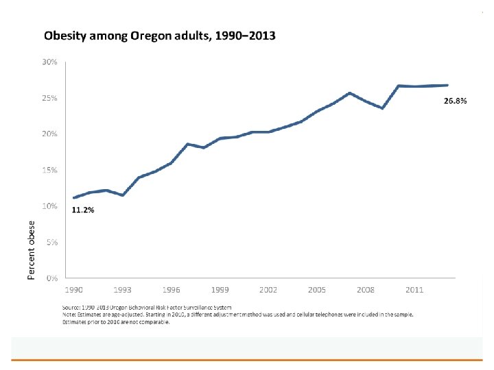 Goal: Slow the rise of obesity among adults to less than 30% by 2017 27% 2010 baseline 27% 2013 current Obesity among adults in Oregon has remained stable since 2010