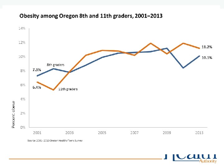 Goal: Lower obesity among 8 th graders to less than 11% by 2017 11% 2009 baseline 10% 2013 current