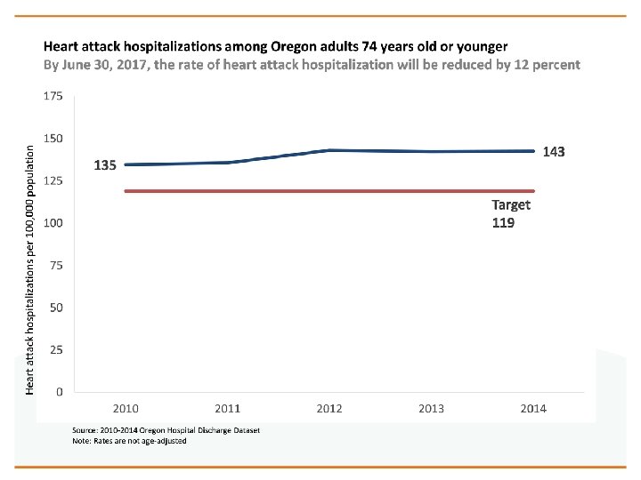 Goal: The rate of heart attack hospitalization among Oregon adults ages 74 or younger will be reduced by 12 percent 135 per 100, 000 2010 baseline 143 per 100, 000 2014 current