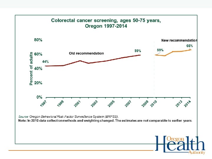 Actions to increase CRC screening • 2014 and 2015 Oregon legislation to remove cost barriers to CRC screening • Oregon’s Coordinated Care Organizations CRC incentive measure • Inter. Community Health Network CCO grants to Linn, Benton and Lincoln counties to promote CRC screening • OHA-PHD grant to promote best practices with health systems