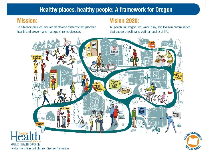 Health Promotion Chronic Disease Prevention framework § Allows state, local and tribal governments to collaborate with community partners to put health within reach of all people in Oregon. § Promotes chronic disease prevention, early detection and selfmanagement § Provides a public health approach of “programmatic and policyinterventions to influence social norms, systems, networks. ”