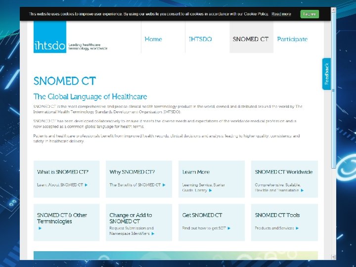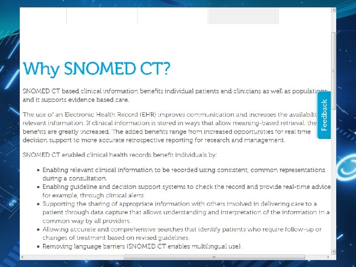 SNOMED CT v. SNOMED CT can be used to record clinical details of individuals in the electronic patient records. v. It also provides the user with a number of linkages to clinical care pathways, shared care plans and other knowledge resources, in order to facilitate informed decision-making and support long term patient care. v. The availability of free automatic coding tools and services, which can return a ranked list of SNOMED CT descriptors to encode any clinical report, could help healthcare professionals to navigate the terminology.