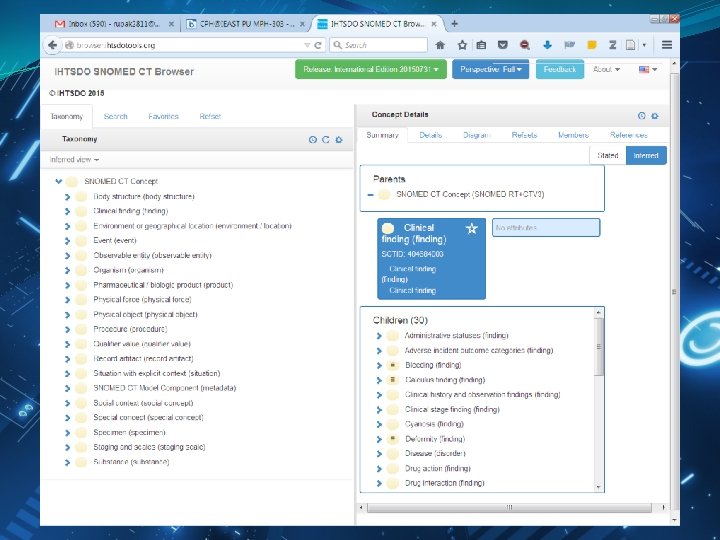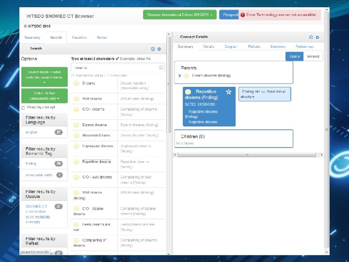 SNOMED q. The Systematized Nomenclature of Medicine (SNOMED) is the most widely recognised nomenclature in healthcare. q. Its current version, SNOMED Clinical Terms (SNOMED CT), is intended to provide a set of concepts and relationships that offers a common reference point for comparison and aggregation of data about the health care process. q. SNOMED CT is often described as a reference terminology.