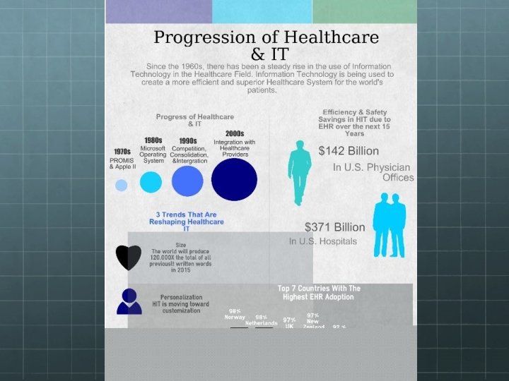 History of Healthcare and IT Integration in the 1970 s PROMIS Taking advantage of third generation computers, in 1968 development of the PRoblem Oriented Medical Information System (PROMIS*) was begun by Dr. Lawrence Weed at the University Medical Center in Burlington, VT (Mc. Neill, 1979). The importance of this system lies in the fact that it was the first attempt to provide a total, integrated system that included all aspects of health care including patient treatment. The PROMIS system also made it possible to see the relationship between conditions, treatments, costs, and outcomes.