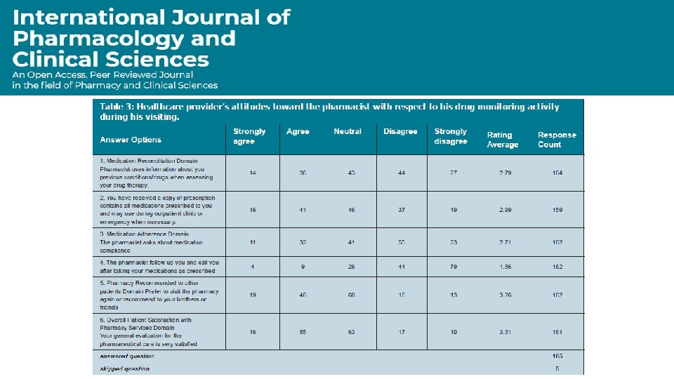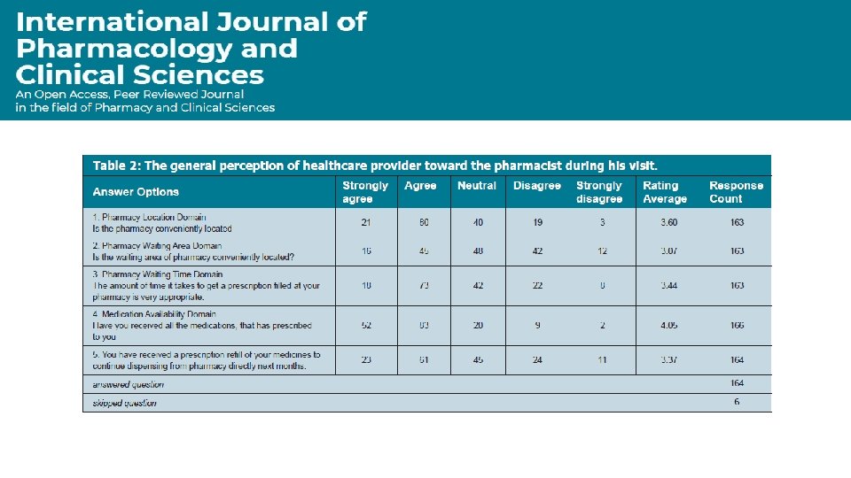 ABSTRACT: Purpose: To explore the healthcare professional’s perception and attitude toward pharmacist during pharmacy visit in Saudi Arabia. Methods: This is a 4 -month cross-sectional survey of the healthcare professional’s perception toward pharmacist. The survey consisted of two parts: the first part collects demographic information and the second part has 49 questions divided into four domains: (1) the first domain captures information regarding healthcare professionals’ general perception of the pharmacist; (2) the second domain is regarding healthcare professionals’ perception of pharmaceutical care services; (3) the third domain is about healthcare professionals’ perception of visiting ambulatory care pharmacy; and (4) the fourth domain is regarding healthcare professionals perception of pharmacist’s relationship and counseling skills. All type of healthcare professionals included in the study. We used the 5 -point Likert response scale system to obtain responses of the participants. There were open- and close-ended questions. The survey was distributed through social media, namely, Whats. App to more than one thousand healthcare professionals throughout the Kingdom of Saudi Arabia. The survey was distributed in an electronic format and this study analyzes and presents data regarding domain three, that is, healthcare professionals’ perception of visiting ambulatory care pharmacy through the Survey Monkey system.