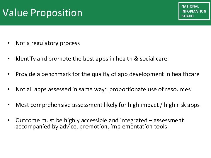 Value Proposition NATIONAL INFORMATION BOARD • Not a regulatory process • Identify and promote the best apps in health & social care • Provide a benchmark for the quality of app development in healthcare • Not all apps assessed in same way: proportionate use of resources • Most comprehensive assessment likely for high impact / high risk apps • Outcome must be highly accessible and integrated – assessment accompanied by advice, promotion, implementation tools