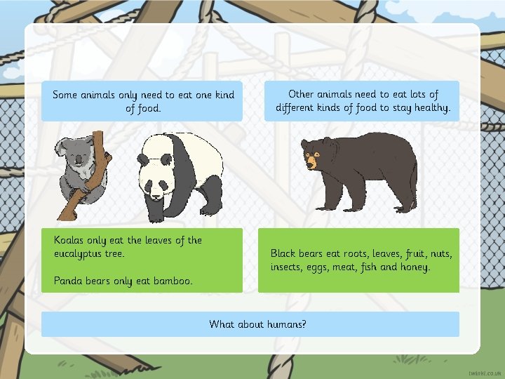 Some animals only need to eat one kind of food. Koalas only eat the leaves of the eucalyptus tree. Other animals need to eat lots of different kinds of food to stay healthy. Black bears eat roots, leaves, fruit, nuts, insects, eggs, meat, fish and honey. Panda bears only eat bamboo. What about humans?