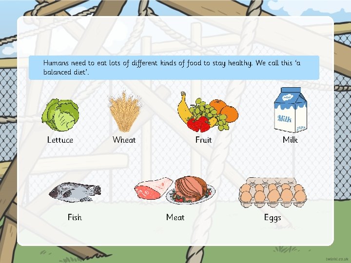 Humans need to eat lots of different kinds of food to stay healthy. We call this ‘a balanced diet’. Lettuce Fish Wheat Fruit Meat Milk Eggs