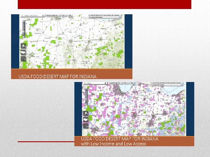 What is a food desert? • A food desert is defined by the USDA as a low-income area in which a large share of residents has low-access to a supermarket or large grocery store. • Low-access to a healthy food retail outlet is defined as more than 1 mile from a supermarket or large grocery store in urban areas and as more than 10 miles in rural areas.