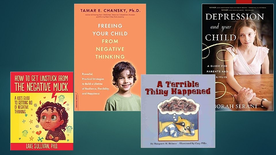 My Favorite Things Apps Calm Search “Anxiety for kids” (Snap’s Stories), “Mindfulness for Kids”, “Relaxation for Kids”, “Feelings Kids” Books for Kids “What to Do When…” Series (Dawn Huebner) Amazon search Books for Adults Cds or music – create a playlist for relaxation EAP – Employee Assistance Program Online or in-person support groups for parents