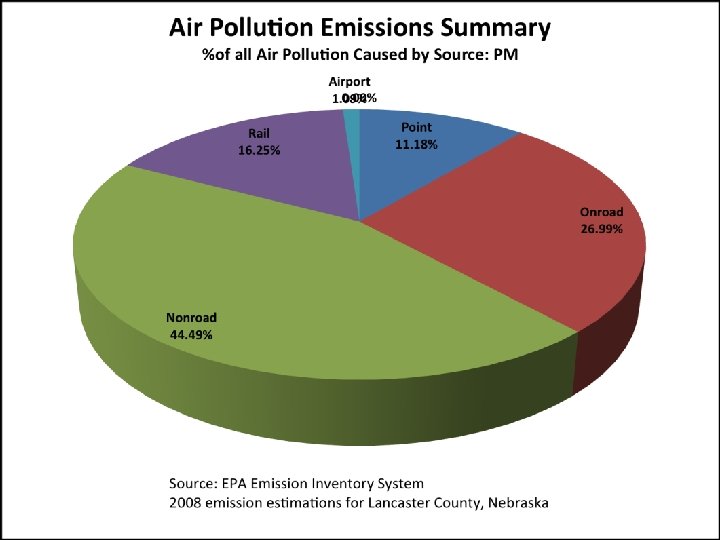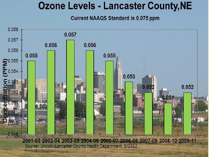 EPA’s Air Quality Index • A simple tool that measures the overall quality of air • Moderate and below = within NAAQS • Overall, Lincoln has good air quality • Rated in top 20 on Ozone • Particulate matter remains a concern