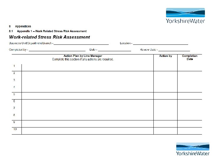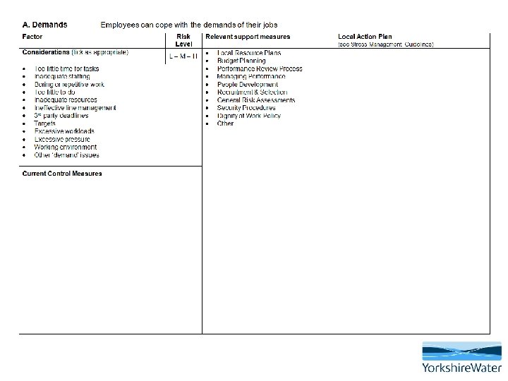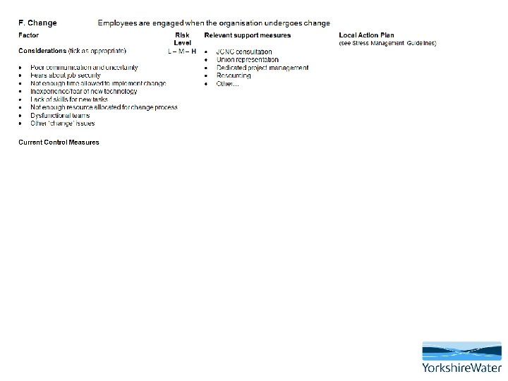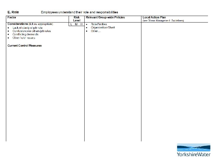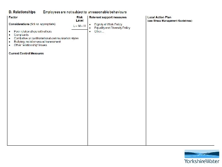 The importance of employee participation • It is essential that workers are consulted and involved in the process of managing psychosocial risks and stress • Employees and their representatives have the best understanding of problems in their workplace and can help to shape planning and implement solutions • A key component of the success of this approach is early intervention and active participation from the employee • The risk assessment can be completed with employees who feel stressed and are at work • If the employee is off work, the risk assessment must be completed BEFORE a return to work is facilitated