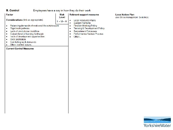 Better understanding Negative outcomes Psychosocial risks time pressure, excessive demands, poor work organisations, job insecurity, role ambiguity, harassment, violence, lack of influence, lack of support, poorlymanaged organisational change, conflicting demands at work and home, etc Emotional Work-related Stress work demands are beyond capacity to cope with them - organisational issue, not individuals’ fault Non work-related factors major life events, serious illness, bereavement, etc irritability, anxiety, low mood, sleeping problems Cognitive difficulty in concentrating, learning new things, making decisions, negative thinking Behavioural making errors, becoming withdrawn or aggressive, substance abuse Physical and mental illhealth depression, burn-out, PTSD, cardiovascular diseases