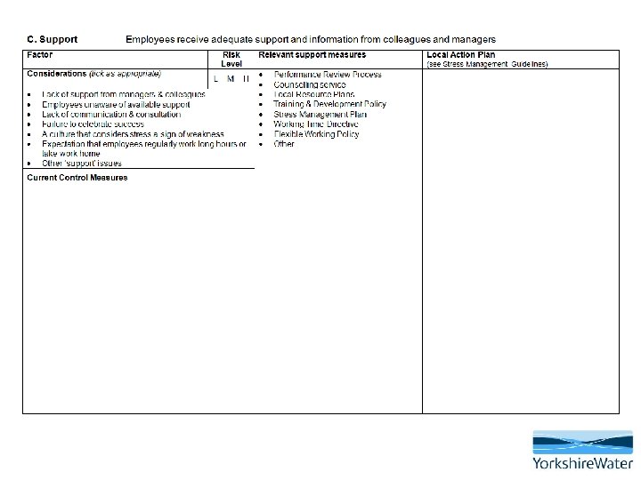 On balance, how significant are the issues/concerns? What more can be done at a local level to help? What has significant potential to cause stress? What issues have team members identified? Do any issues need escalating? What support measures are already in place to manage these issues? What is already in place to manage these issues?