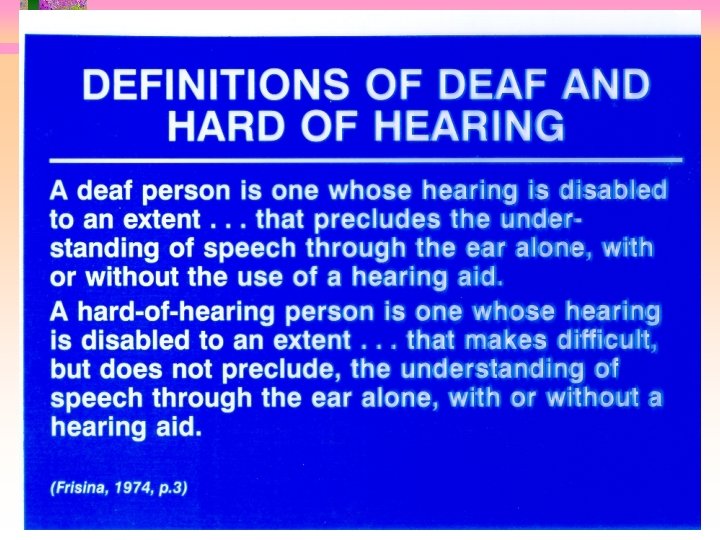 Factors affecting impact of hearing loss • Prelinguistic or post? • Unilateral or bilateral? • Identified & taught sign language before 2 1/2 or after? • Severity of loss