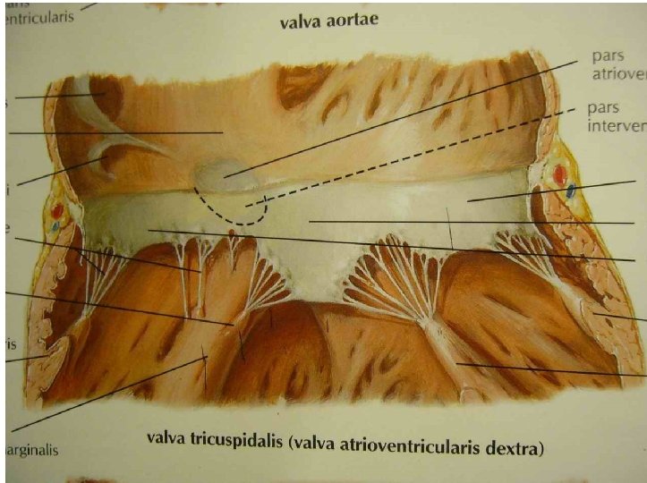 Ventriculus dexter (right ventricle) o ostium atrioventriculare dextrum n valva tricuspidalis p cuspis anterior, posterior, septalis o mm. papillares n anterior, posterior, septalis n chordae tendineae p chordae tendineae falsae s. spuriae o trabeculae carneae n trabecula septomarginalis