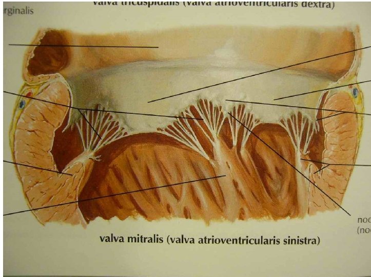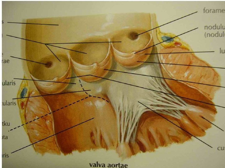 Ventriculus sinister (left ventricle) o ostium atrioventriculare sinistrum n valva mitralis s. bicuspidalis p cuspis anterior, posterior p (cc. commissurales) o mm. papillares n anterior, posterior n chordae tendinaeae o trabeculae carneae o vestibulum aortae o ostium aortae n valva aortae p valvulae semilunares dx. , sin. , post. /semilunar cusps/ n p noduli Aranzii, lunulae, commissurae sinus aortae Valsalvae (correspond to valvulae)