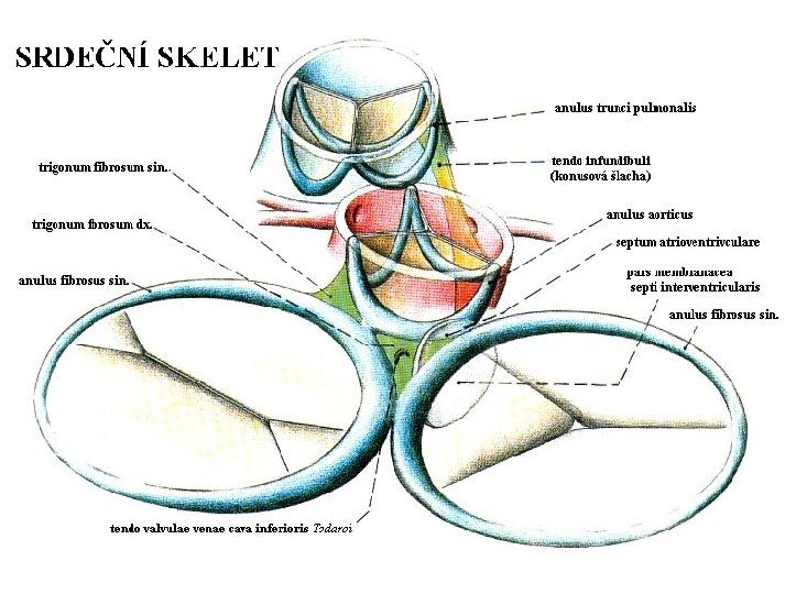 Fibrous skeleton of heart o anulus fibrosus dexter + sinister o trigonum fibrosum dextrum /= central fibrous body/ + o o sinistrum anulus aorticus + a. trunci pulmonalis tendo infundibuli tendo valvulae venae c. inf. Todaroi pars membranacea septi interventricularis o fibrous connective tissue o valve support o myocardium insertion o electric isolation of atrial and ventricular myocardium