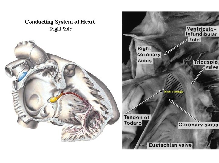 Conducting system of the heart - parts o nodus sinuatrialis (Keith-Flack) n right atrium near foramen v. cavae superioris o interatrial connections (fasciculi atriales) n fasciculus interatrialis (Bachmann) n další svazky sporné p anterior (James), medius (Wenckebach), posterior (Thorel) o nodus atrioventricularis (Aschoff-Tawara) n right atrium in Koch‘s triangle near ostium atrioventriculare dextrum o myocytes smaller than those of working myocardium o rich blood supply