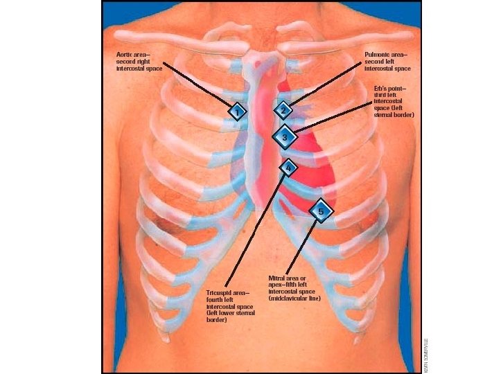 Auscultation – Testut´s points 4 auscultation points o Valva mitralis – 5 th intercostal space left of strenum in medioclavicular line o Valva tricuspidalis – 4 th intercostal space left (or right) of strenum o Valva aortae – 2 th intercostal space right of sternum o Valva trunci pulmonalis – 2 th intercostal space left of sternum o Erb´s point (3 rd intercostal space left of sternum) - murmurs