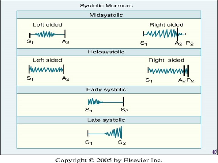Classification & types of murmurs • Systolic murmur • Diastolic murmur • Continuous murmur early systolic mid systolic late systolic pan/holo systolic early diastolic mid diastolic pre systolic