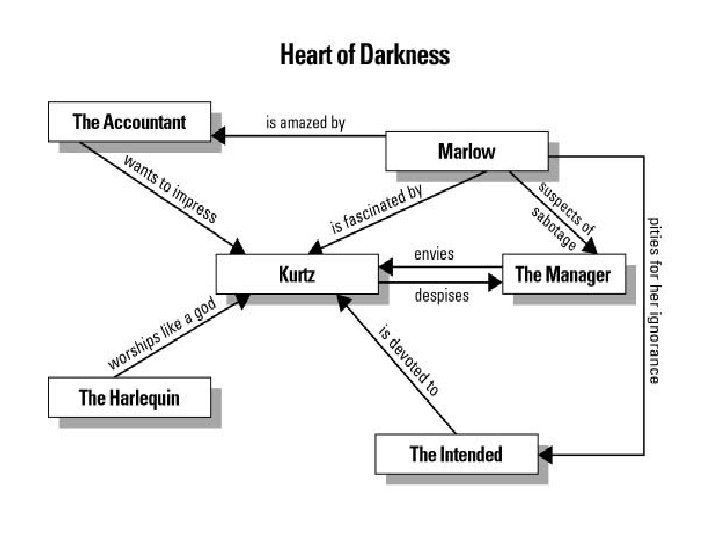 Heart of Darkness Narrative Structure Framed Narrative Narrator begins Marlow takes over Narrator breaks in occasionally Marlow is Conrad’s alter-ego, he shows up in some of Conrad’s other works including “Youth: A Narrative” and Lord Jim Marlow recounts his tale while he is on a small vessel on the Thames with some drinking buddies who are ex-merchant seamen. As he recounts his story the group sits in an all-encompassing darkness.
