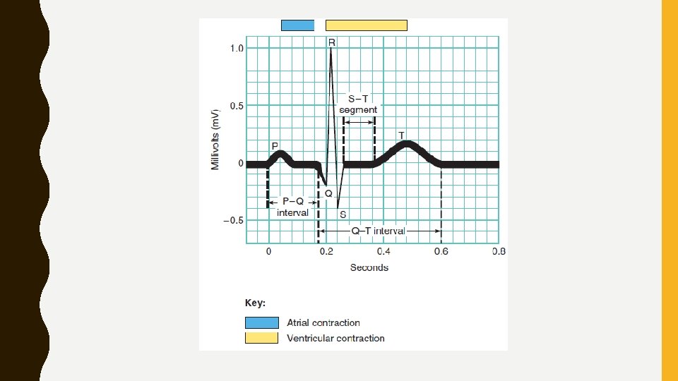 • Intervals or segments- measuring time spans between waves • P–Q interval - time from beginning of P wave to beginning of QRS complex • Represents conduction time from beginning of atrial excitation to beginning of ventricular excitation • Time required for action potential to travel through atria, atrioventricular node, and remaining fibers of conduction system • As action potential is forced to detour (a long or roundabout route taken to avoid something along way) around scar tissue caused by disorders such as coronary artery disease and rheumatic fever, P–Q interval lengthens