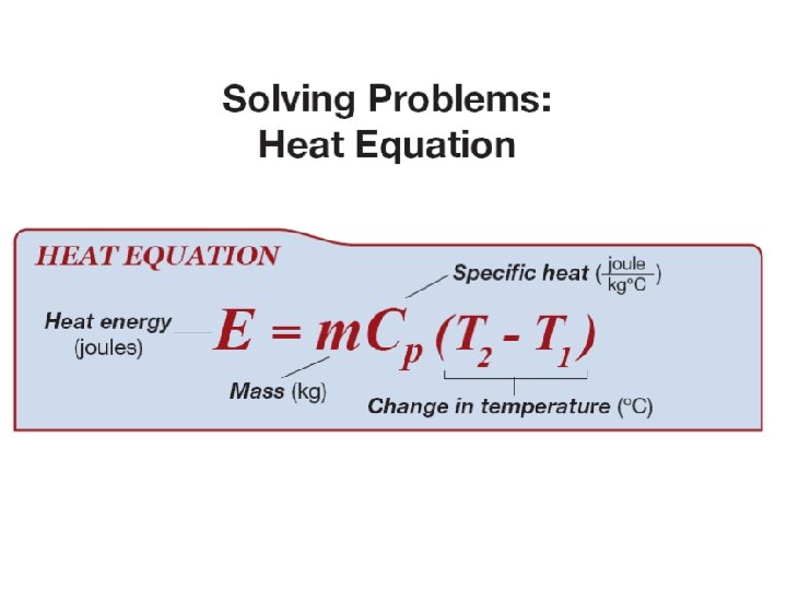 Solving Problems 1. Looking for: Ø …amount of heat in joules 2. Given: Ø V = 250 L, 1 L of water = 1 kg Ø Temp changes from 20°C to 40°C Ø Table specific heat water = 4, 184 J/kg°C 3. Relationships: Ø E = m. Cp(T 2 – T 1) 4. Solution: Ø Sig. E =fig. /Sci. (250 L × not. 1 kg/L) × 4, 184 J/kg°C (40°C - 720°C) 20, 920, 000 J = 2. 1 x 10 J = 20, 920, 000 J