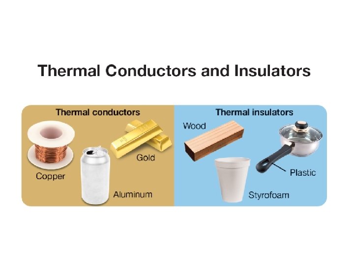 11. 2 Thermal conductors and insulators ØMaterials that conduct heat easily are called thermal conductors and those that conduct heat poorly are called thermal insulators. Is a down coat a conductor or an insulator?