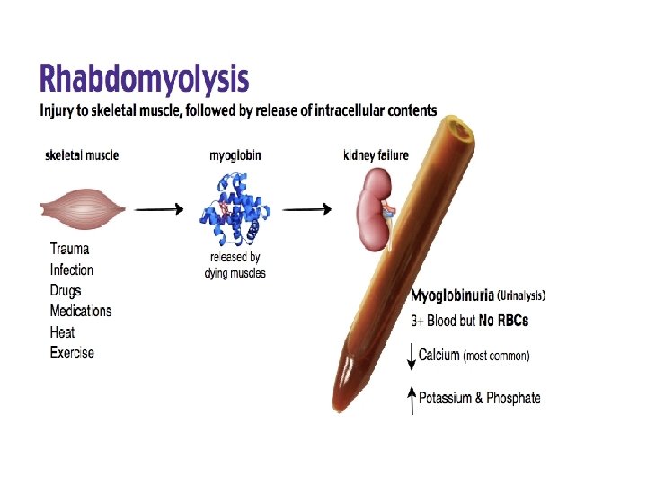Rhabdomyolysis • Ongoing care – – Repeat CK, elctrolytes and renal function in a few days CK goal below 1000 Discontinue myotoxic drugs if any Activity as tolerated after normalization of labs • Diet – When rhabdo causes renal failure restrict protein intake to lower BUN – Limit potassium intake if renal failure