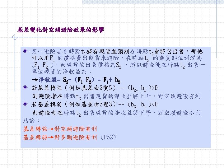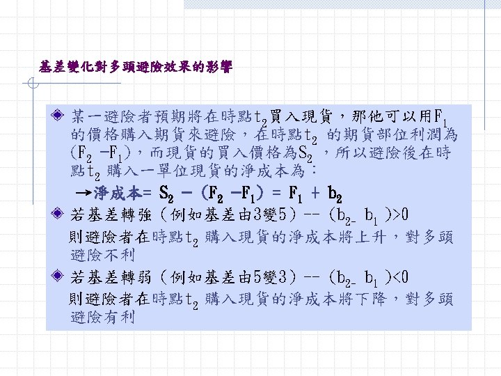 基差變化對多頭與空頭避險效果的影響 S 1 : spot price at time t 1 (在時點t 1的現貨價格) S 2 : spot price at time t 2 (在時點t 2的現貨價格) (Final Asset Price ) F 1 : futures price at time t 1 (在時點t 1的期貨價格) ( Initial Futures Price) F 2 : futures price at time t 2 (在時點t 2的期貨價格) (Final Futures Price) b 1 : basis at time t 1 (在時點t 1期貨之基差) →b 1= S 1 - F 1 b 2 : basis at time t 2 (在時點t 2期貨之基差) →b 2 =S 2 - F 2