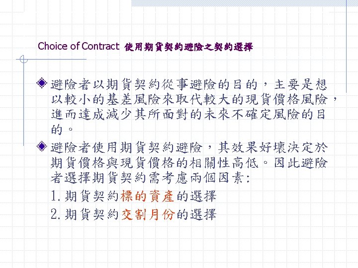 Optimal number of contracts QA : Size of position being hedged (units) - 避險部位的多寡 QF : Size of one futures contract (units) - 期貨合約的多寡 N* : Optimal number of futures contracts fot hedging (避險期貨合約的最適數量) N * = h * QA QF … (3. 2)