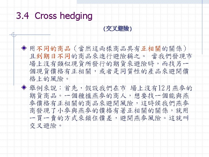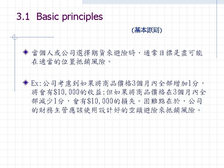 目錄 3. 1 3. 2 3. 3 3. 4 3. 5 3. 6 Basic principles Arguments for and against hedging Basis risk Cross hedging Stock index futures Rolling the hedge forward Summary