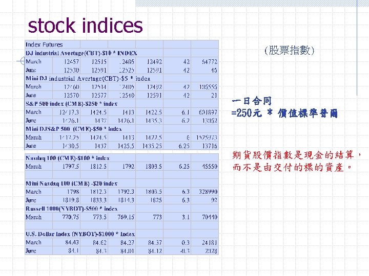 3. 5 Stock index futures we now move on to consider stock index futures and how they are used to hedge or manage exposures to equity prices. A stock index tracks changes in the value of a hypothetical portfolio of stocks. the weight of a stock in the portfolio equals the proportion of the portfolio invested in the stock. Dividends are usually not included in the calculation so that the index tracks the capital gain/loss from investing in the portfolio. Some indices are constructed from a hypothetical portfolio consisting of one of each of a number of stocks. Other indices are constructed so that weights are proportional to market capitalization