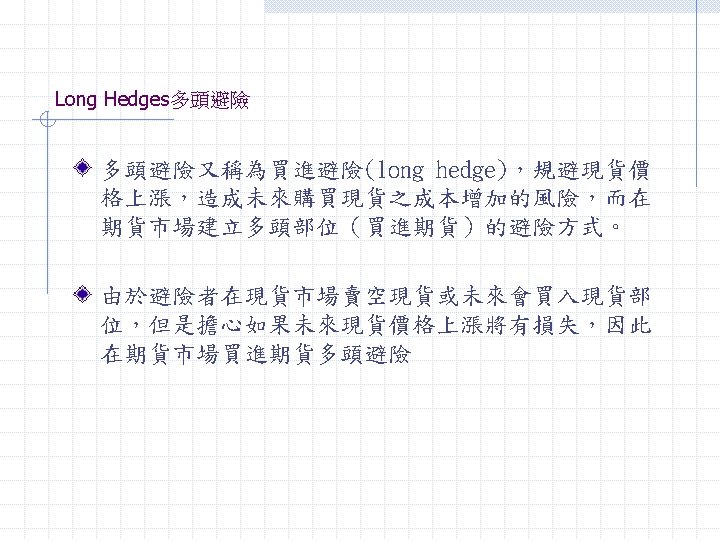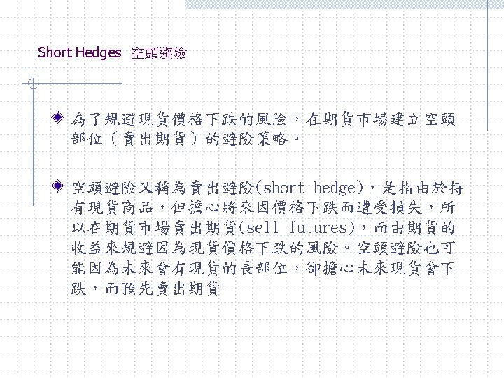 Hedging Strategies Using Futures 指導教授:吳銘政 95320005 蔡雅蘋 95320008 林佩儀 95320009 賴枚汮 95320021 陳佩絨 95320022 95320025 95320029 95320030 鐘于媜 林彥伶 羅婉瑜 蔡佳君