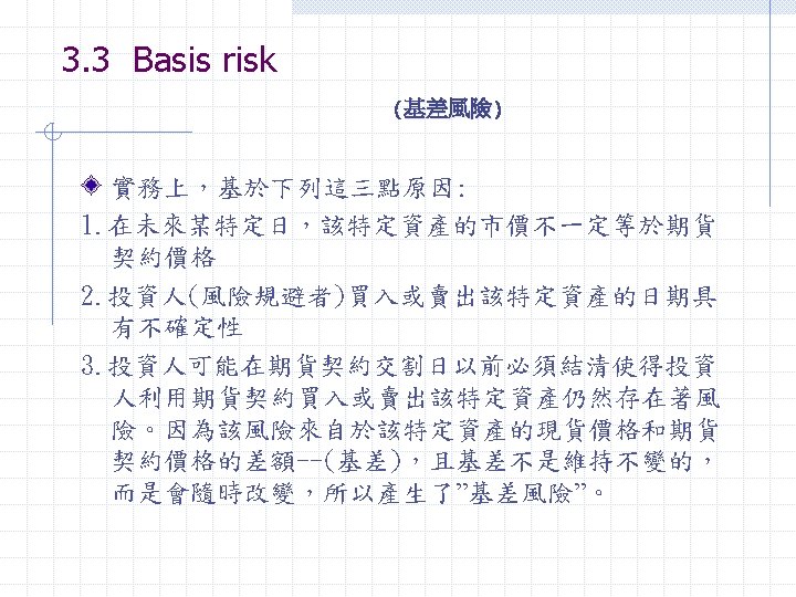 The Basis 基差 基差是期貨價格與現貨價格的差距 Bais=Spot price of asset to be hedged – Futures price of contract used →基差(B)=現貨價格(S)-期貨契約價格(F)