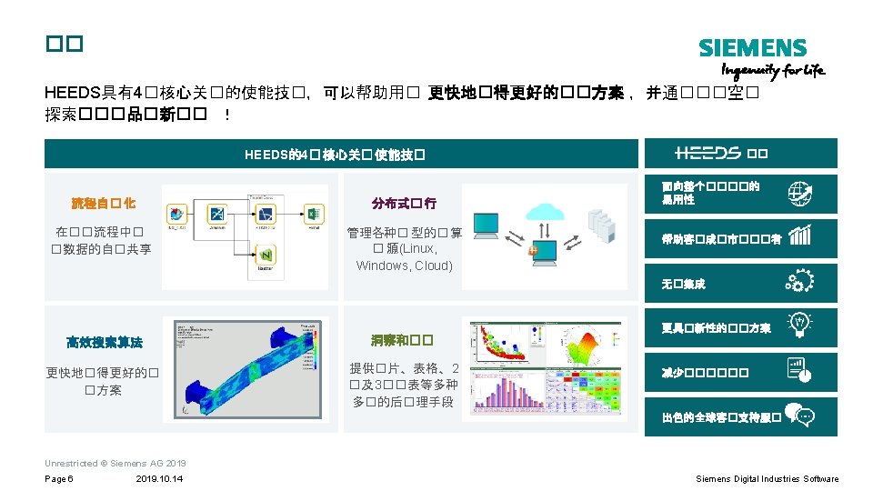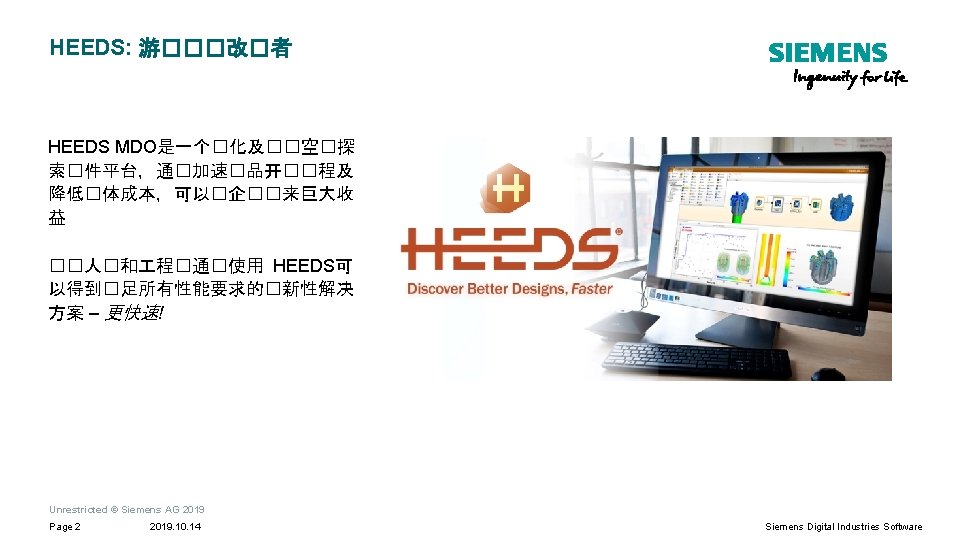 HEEDS Elevator Pitch Where today meets tomorrow HEEDSSimcenter Slides: 6 Download presentation 探索更�的�� , 更快速! HEEDS Elevator Pitch Where today meets tomorrow. HEEDS使得Simcenter的�新��成�可能 系� 仿真 Simcenter 3 D, Simcenter STAR-CCM+, Simcenter Nastran, Simcenter Femap, Simcenter FLOEFD, Simcenter MAGNET, Simcenter Madymo, Simcenter Tyre, Simcenter Motorsolve, Simcenter Speed 物理�� 探索和分析 - HEEDS CAE仿真 数据和流程管理 - Teamcenter Simcenter Amesim, Simcenter Flomaster Simcenter System Architect, Simcenter System Analyst Simcenter Embedded Software Designer, Simcenter Prescan Simcenter Testlab, Simcenter Testxpress Simcenter Tecware, Simcenter T 3 STER, Simcenter TERALED, Simcenter POWERTESTER Unrestricted © Siemens AG 2019 Page 3 2019. 10. 14 Siemens Digital Industries Software HEEDS加速�新�品开� Abaqus/CAE Adams/Car Adams/Chassis Adams/View Simcenter Amesim ANSA ANSYS Aspen HYSYS Autodesk Inventor AVL-DVI AVL-EXCITE Piston&Rings CATIA Creo Parametric Es-ice Excel Simcenter FEMAP Simcenter Flo. EFD Simcenter Flo. MASTER Simcenter Flo. THERM Fluent 2 D Fluent 3 D FMI GTI JMAG LS-DYNA Simcenter MADYMO MATLAB Moldflow Nastran NX CAD Pro-STAR Python Ricardo SDF Simcenter Samcef Solid Edge Solid. Works Simulation Simcenter STAR-CCM+ STAR-CD Simcenter 3 D Motion 2019. 10. 14 Unrestricted © Siemens AG 2019 Page 4 Add Your Simcenter Tool System Synthesis Siemens Digital Industries Software