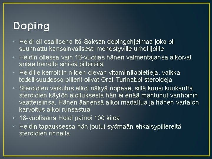 Doping • Heidi oli osallisena Itä-Saksan dopingohjelmaa joka oli suunnattu kansainvälisesti menestyville urheilijoille • Heidin ollessa vain 16 -vuotias hänen valmentajansa alkoivat antaa hänelle sinisiä pillereitä • Heidille kerrottiin niiden olevan vitamiinitabletteja, vaikka todellisuudessa pillerit olivat Oral-Turinabol steroideja • Steroidien vaikutus alkoi näkyä nopeaa, sillä kuusi kuukautta steroidien käytön aloituksesta hän ei enää mahtunut vanhoihin vaatteisiinsa. Hänen äänensä alkoi madaltua ja hänen vartalon karvoitus alkoi runsastua • 18 -vuotiaana Heidi painoi 100 kiloa • Heidin tapauksessa hän joutui syömään ehkäisypillereitä steroidien rinnalla
