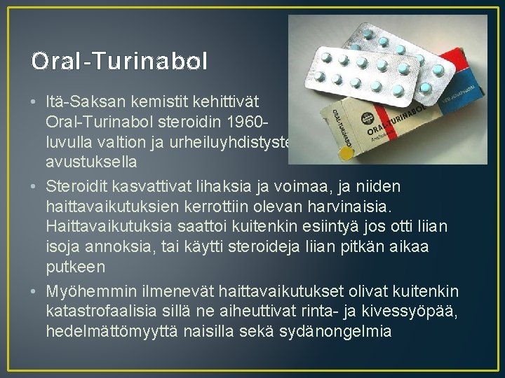 Oral-Turinabol • Itä-Saksan kemistit kehittivät Oral-Turinabol steroidin 1960 luvulla valtion ja urheiluyhdistysten avustuksella • Steroidit kasvattivat lihaksia ja voimaa, ja niiden haittavaikutuksien kerrottiin olevan harvinaisia. Haittavaikutuksia saattoi kuitenkin esiintyä jos otti liian isoja annoksia, tai käytti steroideja liian pitkän aikaa putkeen • Myöhemmin ilmenevät haittavaikutukset olivat kuitenkin katastrofaalisia sillä ne aiheuttivat rinta- ja kivessyöpää, hedelmättömyyttä naisilla sekä sydänongelmia